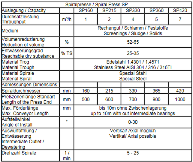 Das Rechengut wird in die Spiralpresse gegeben. Die Förderung erfolgt mittels einer extrem kräftigen Förder-Pressspirale bis zu einer Länge von 10 m. Die Förderspirale endet in einer Presszone, in der die Förderspirale von einem perforierten Pressrohr umschlossen ist. Mit Hilfe einer Gegendruckluke am Ende und einer nur teilweise in das Pressrohr mündende Förderspirale bildet das Fördergut einen Friktionspfropfen und wird bei gleichzeitiger Entwässerung komprimiert. Durch die schiebende Antriebseinheit, die wellenlose Spirale und das freiliegende Spiralende ist ein verstopfungsfreier Betrieb gewährleistet. Aus Hygienegründen ist die gesamte Länge der Maschine mit geschraubten Deckeln abgedeckt, außer im Bereich des Einfülltrichters.
