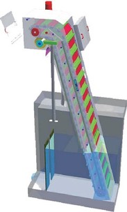 Die Kette, an dem die einzelnen Filterblöcke verschraubt sind, dreht in Vorwärtsrichtung , wenn der Wasserstand vor dem Rechen größer als hinter dem Rechen ist oder nach einem zeitlichen Intervall.
